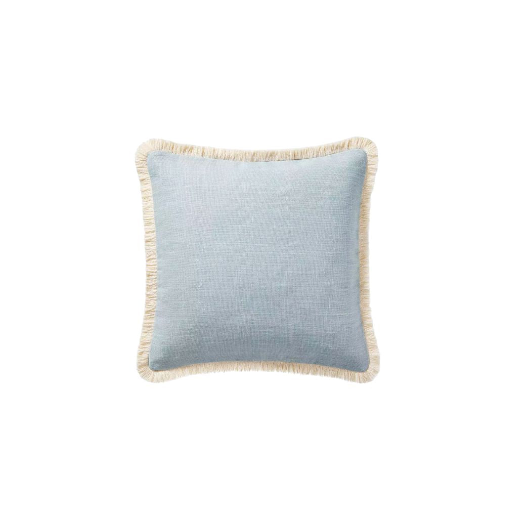 Light Blue Linen Pillow framed with a neutral fringe