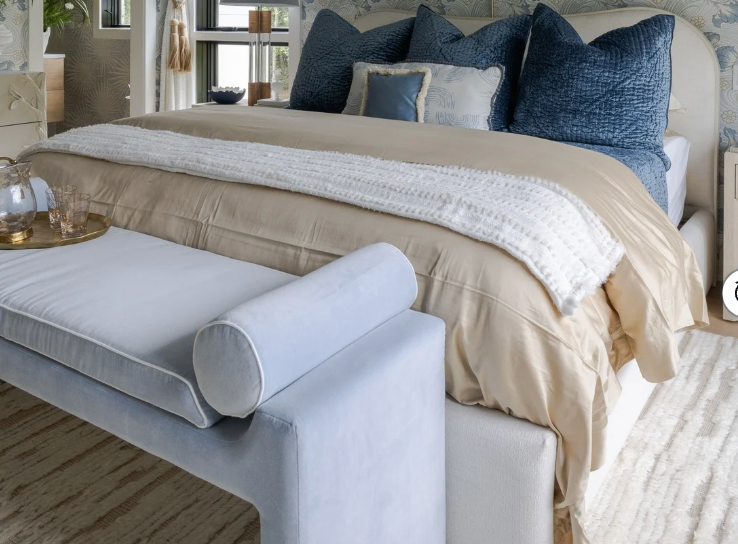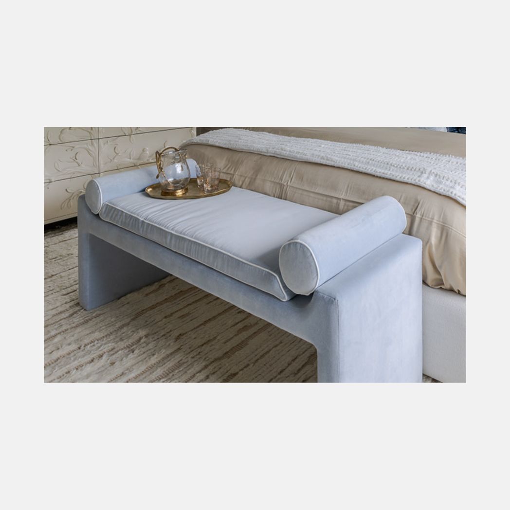 Custom Upholstered Bench with Bolster Pillows. Upholstered in a soft blue velvet piped in white...