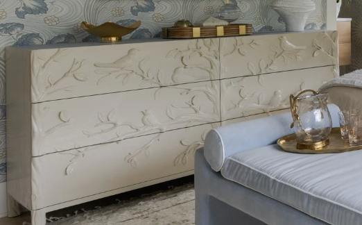 Depicting a serene treetop scene, this handcarved dresser is inspired by classic, romantic design, and...