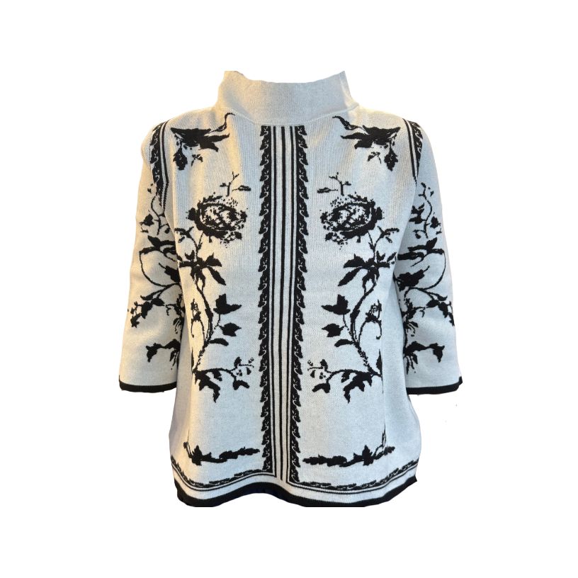 A refined knit with vintage charm. Featuring a black floral jacquard on soft ivory, this...