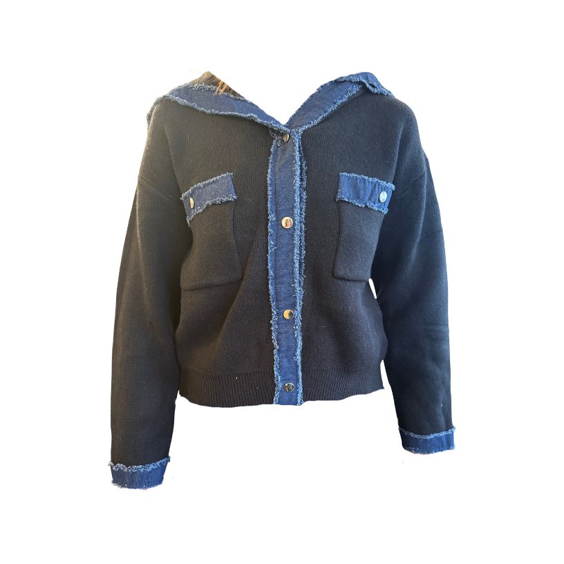 A fresh twist on a classic knit. This button-up cardigan features raw denim trim, flap...