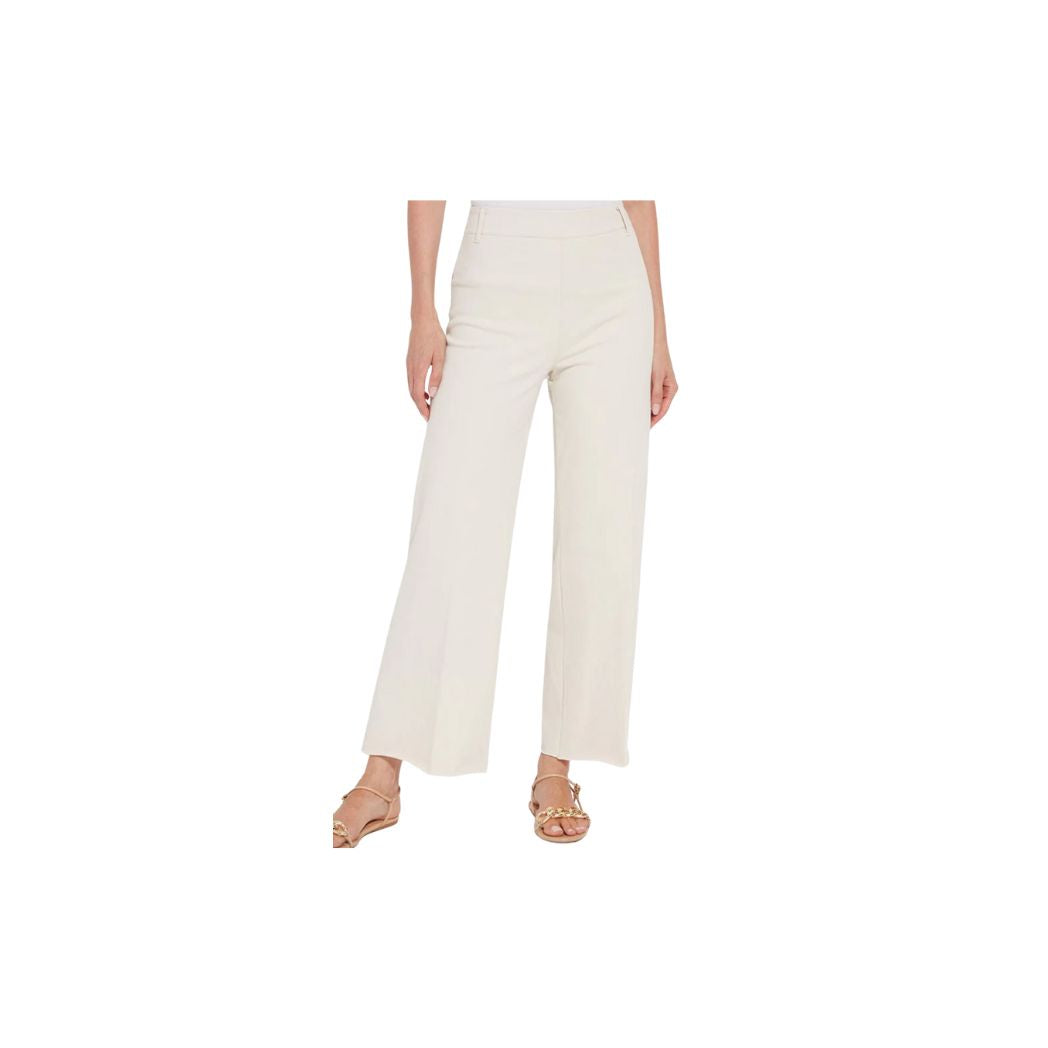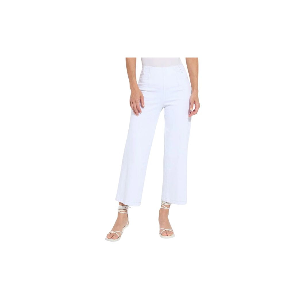 A smoothing waistband enhances the comfort of cropped wide-leg pants cut from a stretchy denim-like...