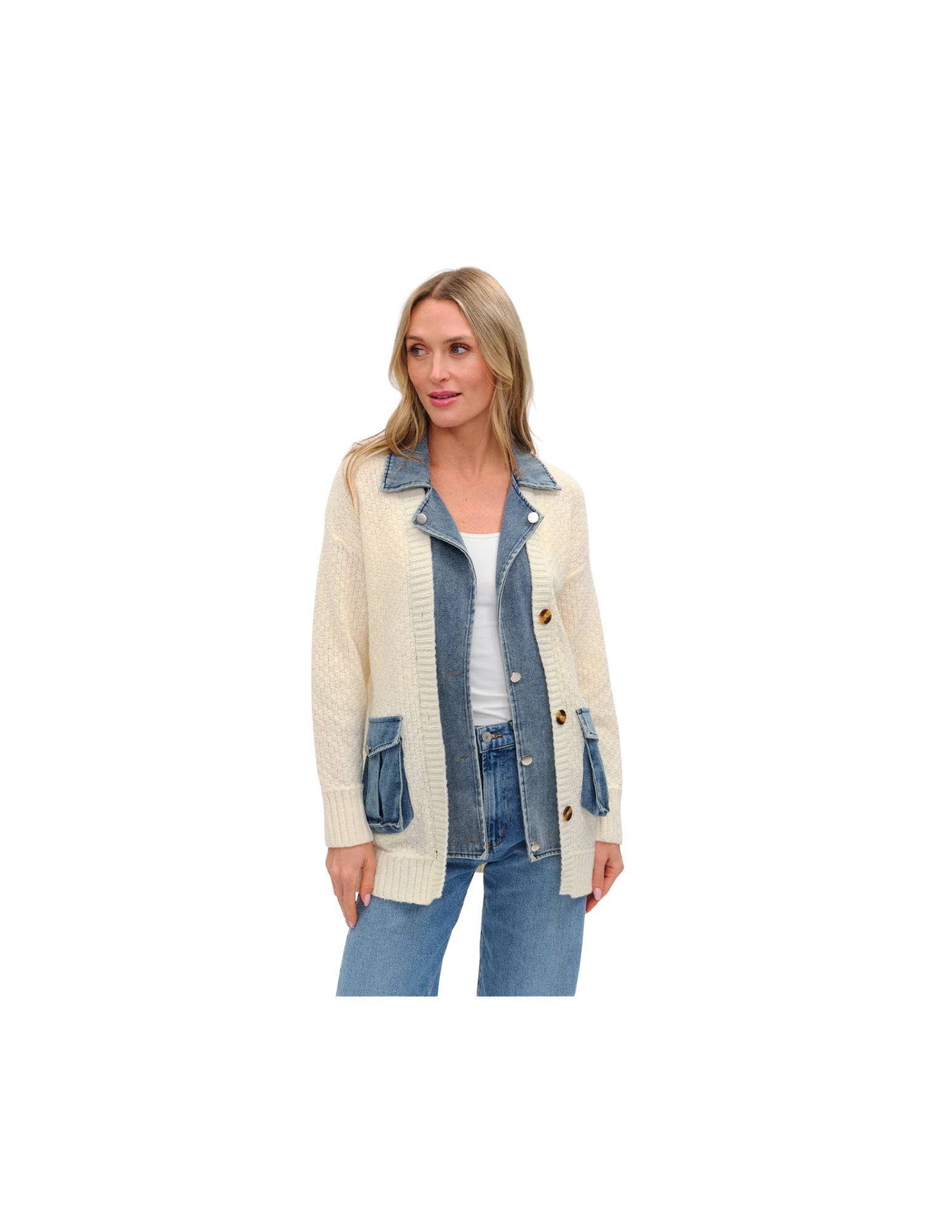 The Rachel Cardigan playfully layers soft, cozy knit with a denim material underneath for a...