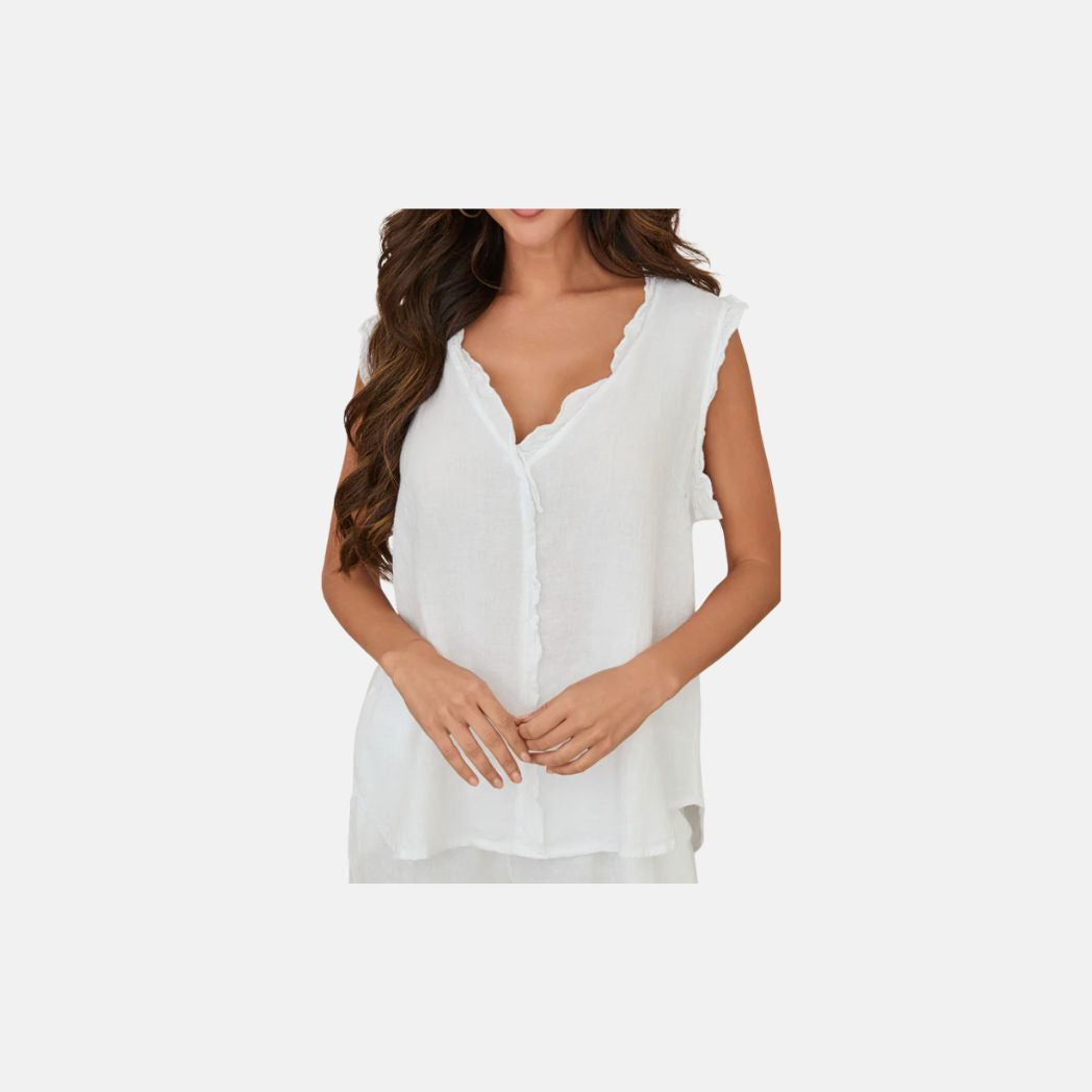 V neckline Ruffled trim detail Loose fit 100% Linen Made in Italy