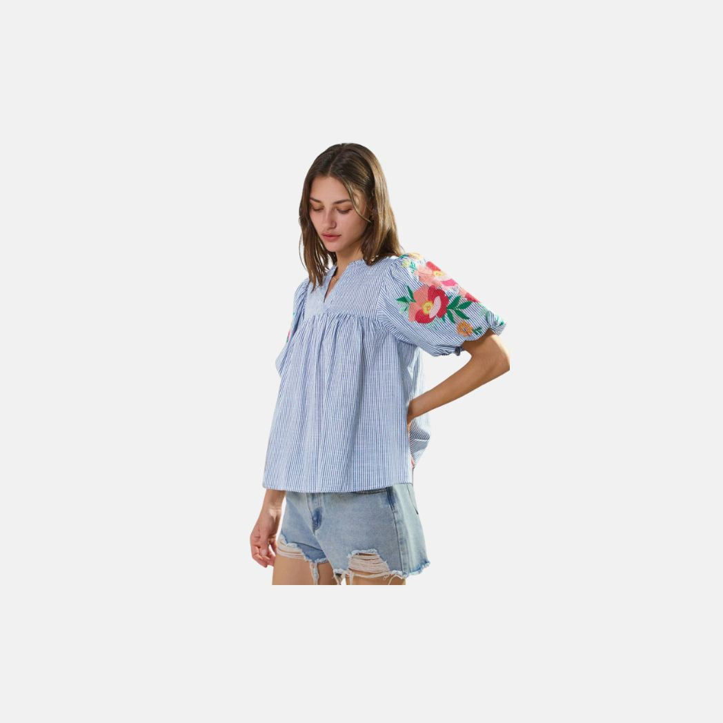 Yarn dye striped fabric blouse with embroidery short bubble sleeve. Also available in sizes 1XL...
