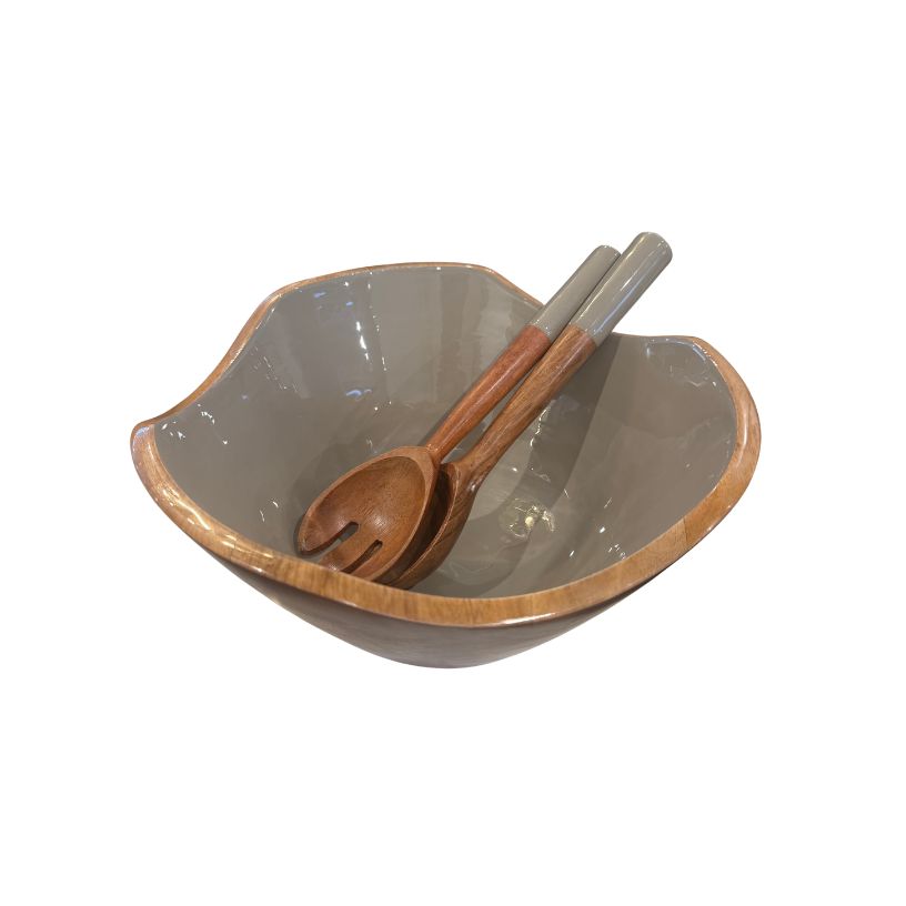 Handcrafted Mango Wood Enamel Serving Bowl Set – Natural Taupe