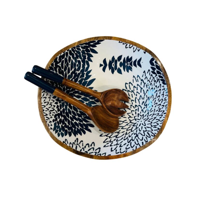 Floral Navy Mango Wood Enamel Serving Bowl & Servers Set