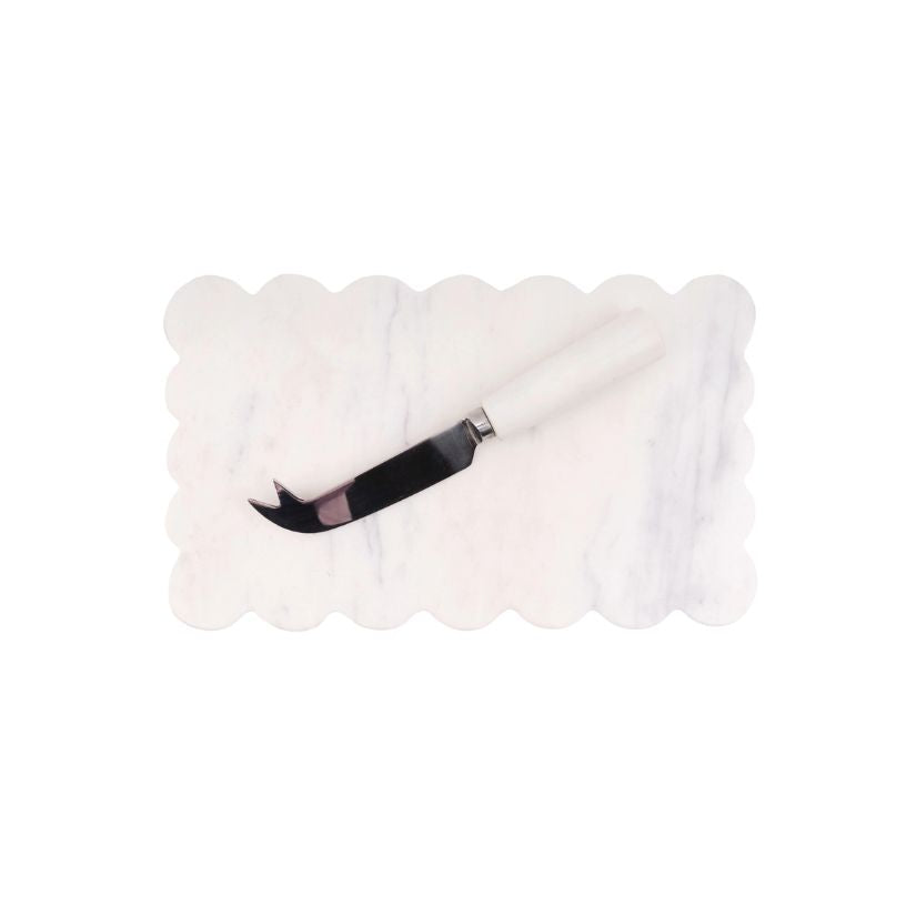 Handcrafted from natural white marble, this scalloped cheese board and knife set adds effortless elegance...